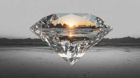 Sharply cut, clear diamond shape hovers centrally over a desolate, monochrome beach scene, the interior facets of the gemstone capturing and magnifying a colorful, warm image of a sun setting or rising over distant water and silhouetted land masses, creating a striking juxtaposition between the crystal clarity and the muted background.