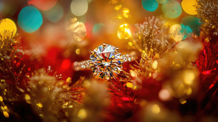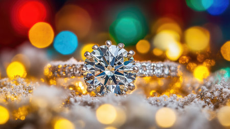 A stunning close-up of a diamond ring set against a vibrant festive background. Colorful bokeh lights create a magical atmosphere, perfect for celebrations.
