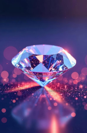 Large, sparkling diamond sits on a glittering purple surface, reflecting light and color in a mesmerizing display of luxury and brilliance, creating a captivating vertical composition