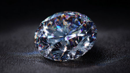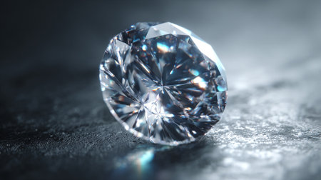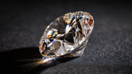 This image showcases a clear, radiant diamond set against a dark and textured surface. The diamond's facets beautifully refract light, creating a sparkling and mesmerizing display of precision.