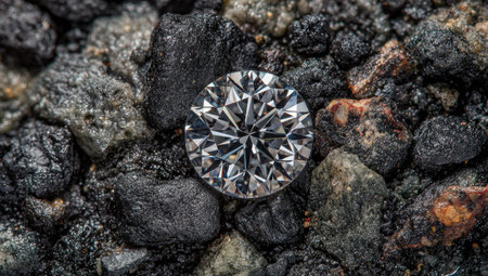 A brilliant-cut diamond is prominently displayed among various dark, textured rocks. The close-up shot emphasizes the gemstone's reflective surface and facets. The composition highlights the contrast between the gem and the rough surroundings, likely indoors, suitable for advertising or editorial content.