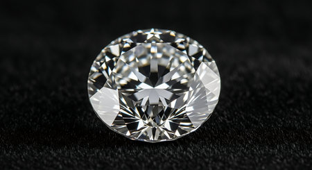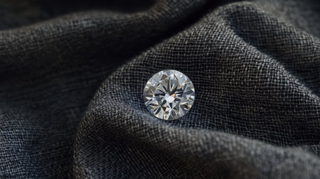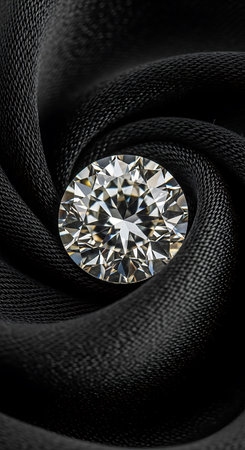 A stunning close-up of a round cut diamond resting on soft dark fabric showcases the gem