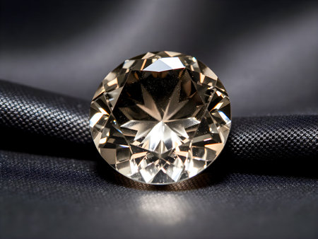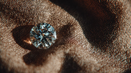 A stunning round diamond rests elegantly on a rich fabric background, highlighting its brilliance and captivating light reflections, creating a warm and inviting atmosphere.