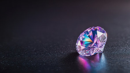 A captivating close-up of a colorful diamond resting on a dark surface, showcasing its intricate cuts and sparkling reflections in an elegant composition.
