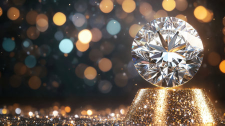 A captivating image featuring a large diamond set on a gold pedestal, with a vibrant bokeh background filled with dazzling lights and a sparkling atmosphere.