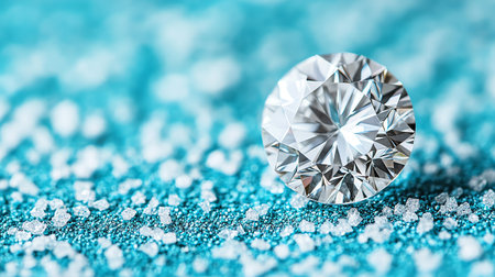 Large, sparkling diamond resting on a dark blue reflective surface, creating a luxurious and elegant atmosphere with a beautiful bokeh effect in the background