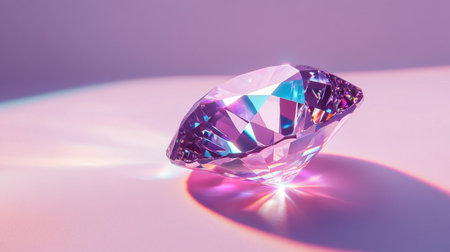 A mesmerizing diamond showcases its radiant facets, reflecting a spectrum of colors on a soft pink background, creating a luxurious and artistic atmosphere.