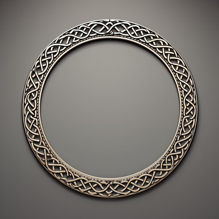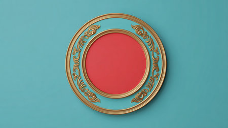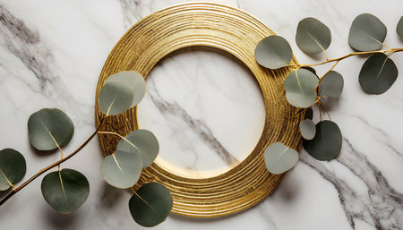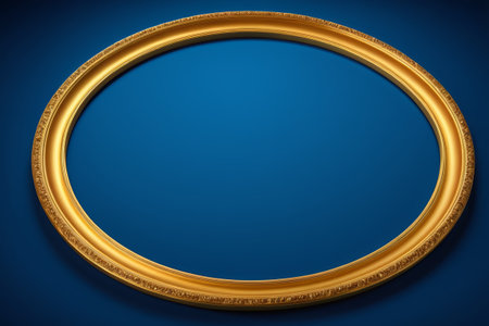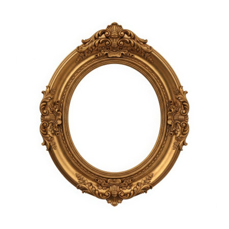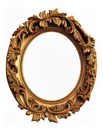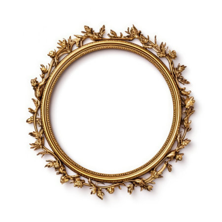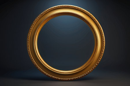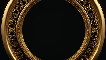 A close-up view of a luxurious gold circular frame with a dark center and intricate detailing.