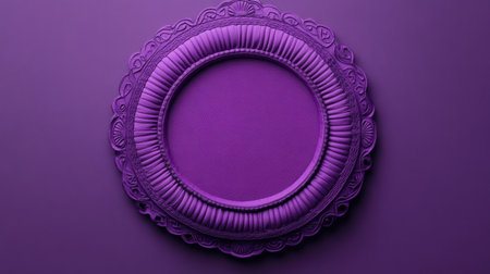 This stock photo features a vibrant purple circular plate with an intricate edge design set against a smooth purple background. Ideal for culinary and home decor themes.