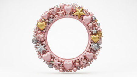 A beautifully crafted wreath adorned with heart shapes, stars, and sparkling embellishments. The wreath features a combination of pink and gold hearts, interspersed with silver and gold stars and glittering decorations. The overall design exudes a festive and romantic ambiance, perfect for celebrating love and special occasions.