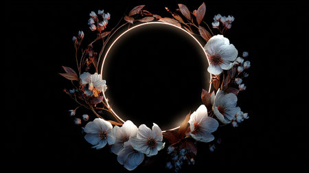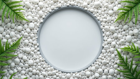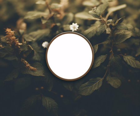 A white circle framed in brown sits amidst lush green leaves and delicate white flowers. The image is calming and peaceful, perfect for a nature-themed background.