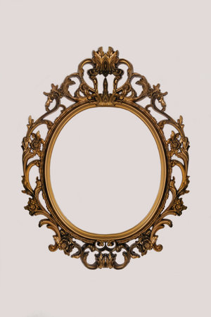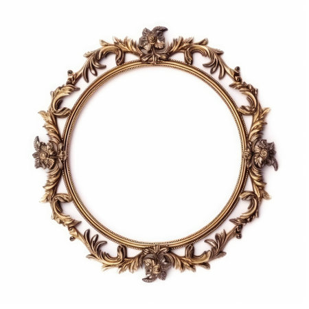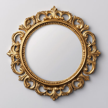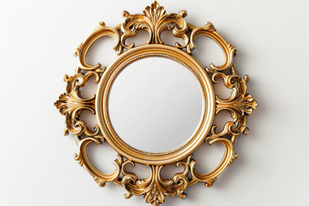 Elegant round mirror with ornate golden frame featuring intricate scroll designs and a minimalist background suitable for interior design and decor concepts