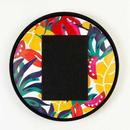 Top view of black tray, colorful plate, black card on white background. Exotic plant plate, summer picnic. Flat lay, copy space.