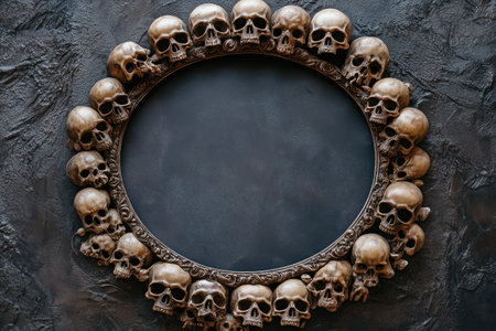 An ornate oval frame crafted from meticulously detailed skulls sits ominously against a deep, dark backdrop. This striking piece exudes a sense of mystery and eerie elegance.
