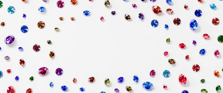 Colorful Gemstones crystal diamond top view placed on white background with frame copy space 3d rendering