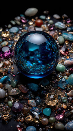 A transparent sphere is illuminated, resting among a collection of various polished gemstones. The composition showcases a rich palette of colors from the reflective orb and surrounding gems. The studio lighting emphasizes the textures of the gems, suggesting the image could be used for commercial purposes, or editorial applications.
