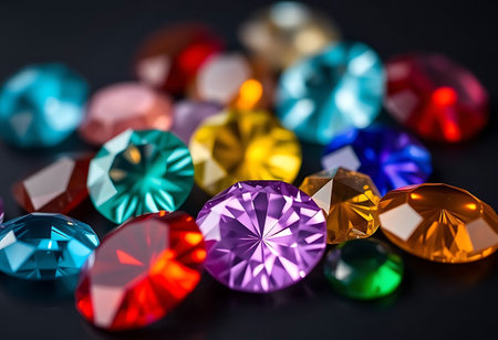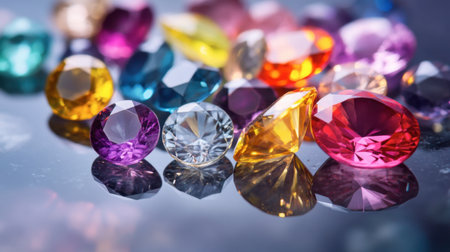 A beautiful close-up of colorful sparkling gems displayed on a shimmering surface. The vibrant colors and reflective qualities create a luxurious and artistic visual perfect for various projects.