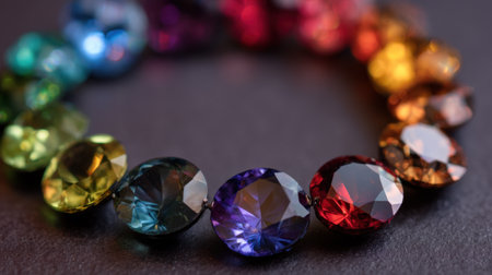 A stunning display of colorful gemstones arranged in a circular pattern on a dark surface, showcasing their brilliant sparkle and clarity. Perfect for illustrating luxury, elegance, and creativity.