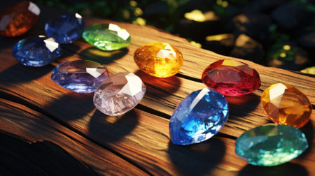 A captivating arrangement of colorful gems sparkling on a wooden surface, showcasing vivid light reflections and a beautiful bokeh effect in the background.
