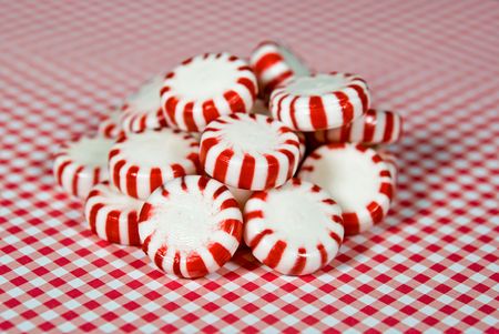 Hard candy peppermints on gingham.