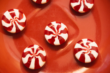 Close up of red and white peppermint candies in a row