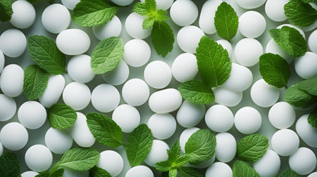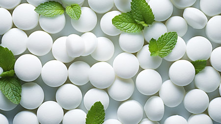Pile of white mints candy with a green mint leaves. Generative AI.