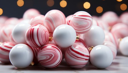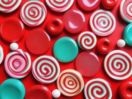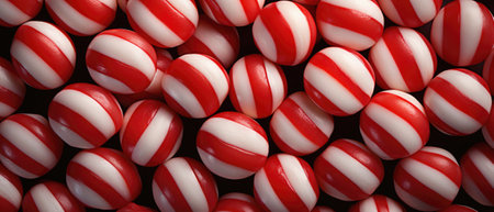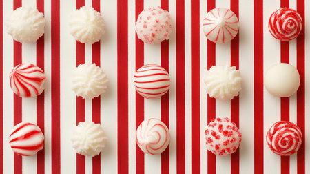 Delightful arrangement of colorful candy spheres on a red and white striped background, perfect for seasonal celebrations, parties, and festive decor.