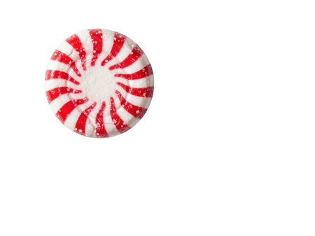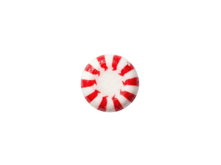 High-quality close-up photograph of a single red and white peppermint candy against a clean, white background. Perfect for holiday and sweet treat themes.