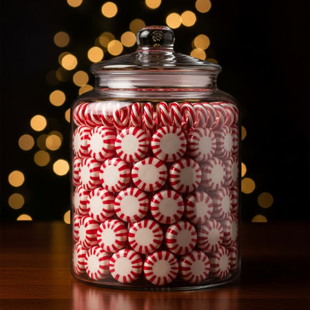 Jar of Christmas Peppermint Candies, Festive Holiday Treats, Warm Golden Lights Background