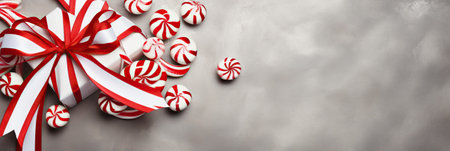 Banner with red and white striped candy canes on a gray background