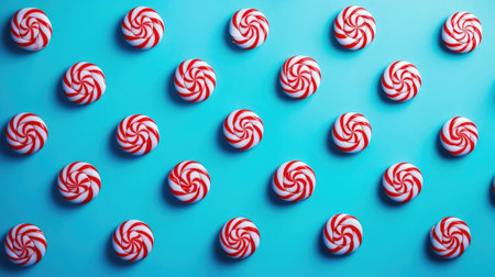 A vibrant pattern of red and white swirl lollipops arranged on a bright blue background.