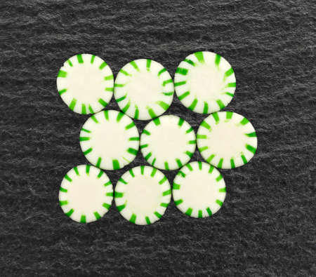 Top view of several spearmint starlight mints on a black slate counter top.