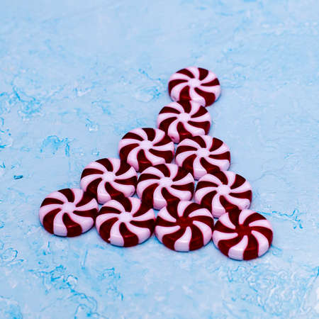 a fir tree lined with round Christmas caramel candies on a blue background. High quality photo