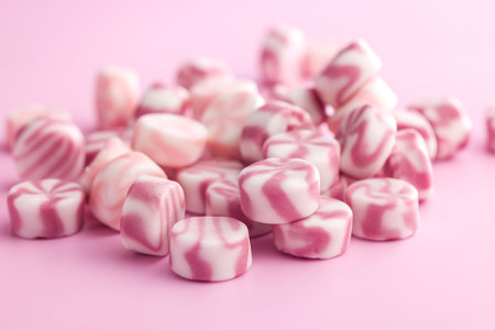 Pink and white peppermint candies arranged in a row on light background