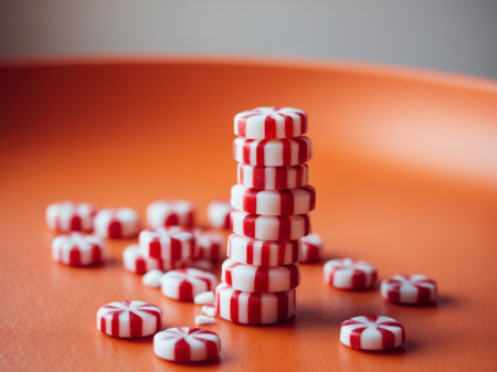 AI Generated. tower of red and white striped peppermint candies on orange surface