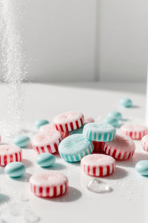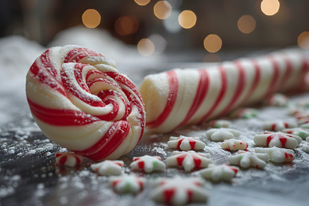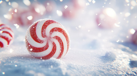Bright red and white peppermint candies rest on a shimmering surface dusted with sugar, capturing the joy of festive celebrations and seasonal treats.
