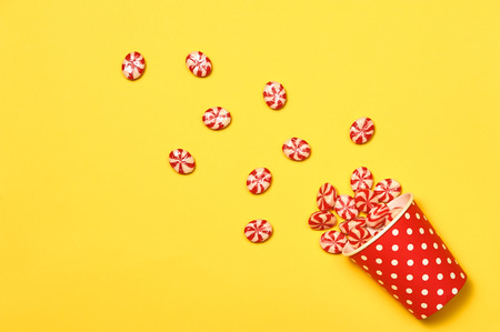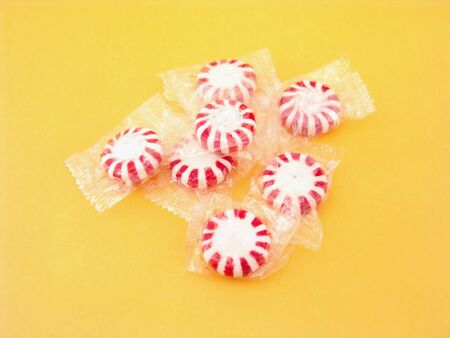 red and white peppermints in plastic wrappers over yellow background