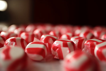 Scattered red and white striped peppermint hard candies captured in harsh cinematic rim lighting wit