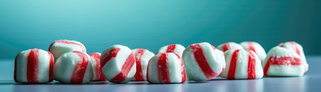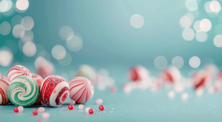Various red and white candy pieces scatter across a light blue surface, creating a festive atmosphere perfect for holiday celebrations and sweet treats. The shiny surfaces reflect light, adding to the cheerful vibe.