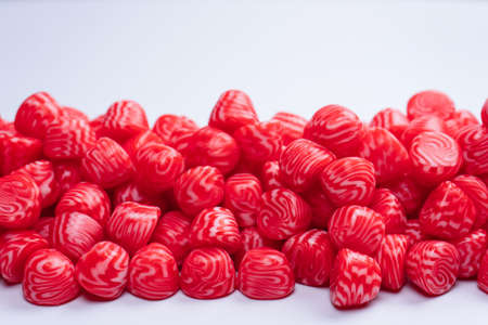 Red and white striped candies on white background. Top view.