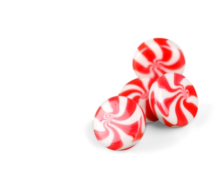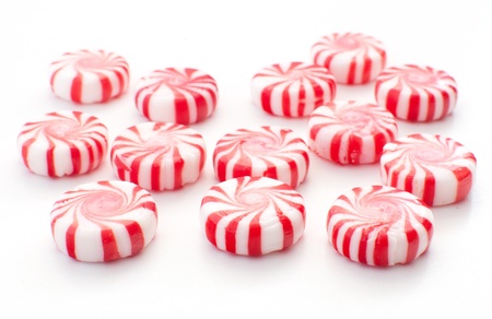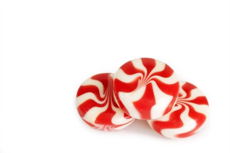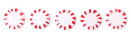 Gourmet white and red peppermint candies on white background.