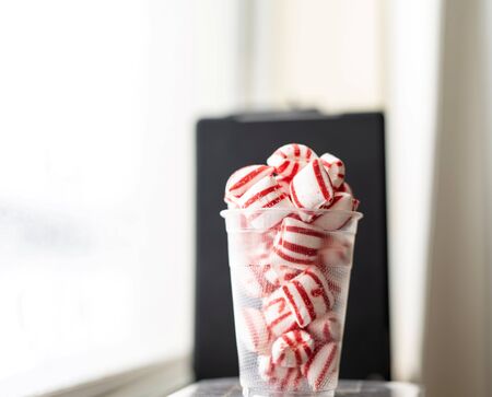 Red and white peppermint candy in a plastic cup in front of dark object with plenty of copy space. Holiday concept with shallow depth of field.