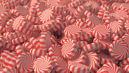 A large, messy pile of Christmas style, red and white swirl candy. This image is a 3D Illustration.