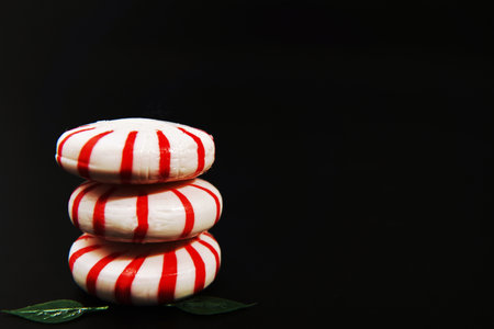 Red and white striped candies on a black background with copy space