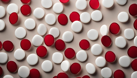 A photograph of red and white circles on a beige background, creating a simple yet captivating pattern.