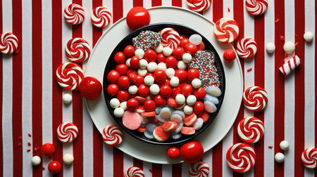 A close-up captures a collection of red and white spiral peppermint candies presented in a circular ceramic bowl. The candies are arranged in an overhead composition. The scene suggests a festive or culinary context, likely suited for commercial or editorial applications, highlighting treats or sweets.