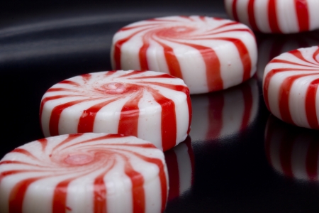 Red striped peppermints on a black background.