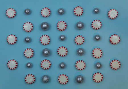 A top view of peppermint candy with silver balls on a seamless pattern against a blue surface