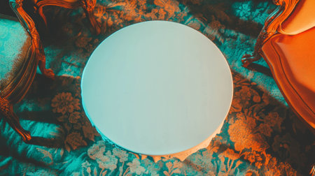 Elegant overhead view of white circular podium on ornate carpet for interior design