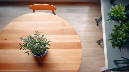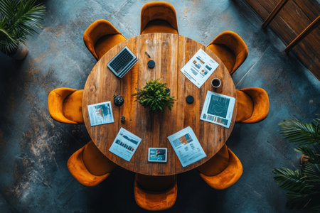 A creative overhead shot of round wooden table with orange chairs, featuring documents, tablet, and plant, creating productive atmosphere..